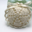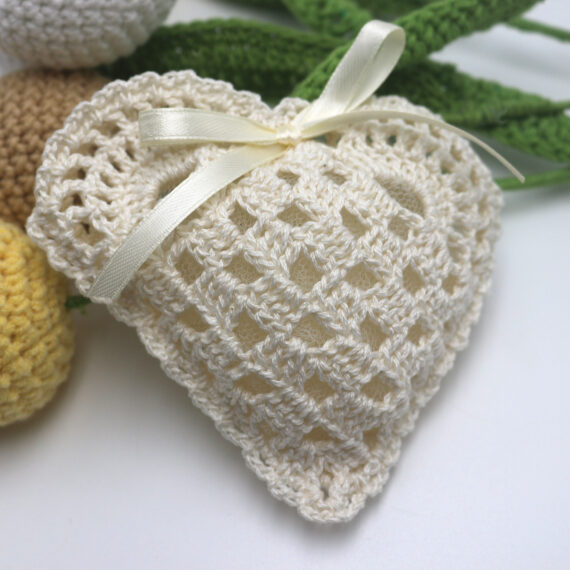 Xειροποίητη πλεκτή μπομπονιέρα γάμου. Πλεγμένη με ποιοτικό βαμβακερό νήμα αποπνέει ρομαντισμό και κομψότητα. Στο σχέδιό της σχηματίζονται 6 καρδιές σε κύκλο που συμβολίζουν την αγάπη. Ιδανική για vintage ή boho θεματικούς γάμους.