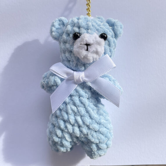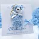 Κάρτα με την επιγραφή “Welcome to the World Baby”, διακοσμημένη με ένα απαλό πλεκτό γαλάζιο αρκουδάκι μπρελόκ. Περιλαμβάνει τυπωμένα το όνομα και την ημερομηνία γέννησης του μωρού, δημιουργώντας ένα τρυφερό και προσωπικό ενθύμιο αυτής της ξεχωριστής στιγμής.