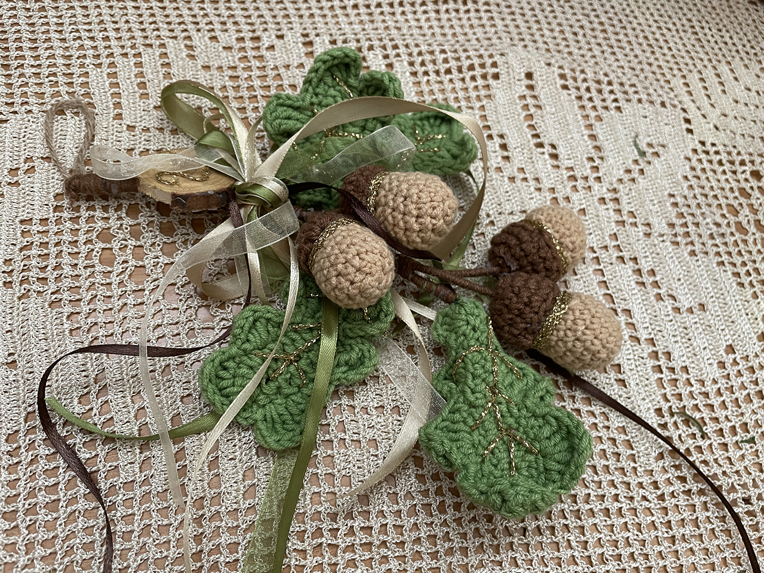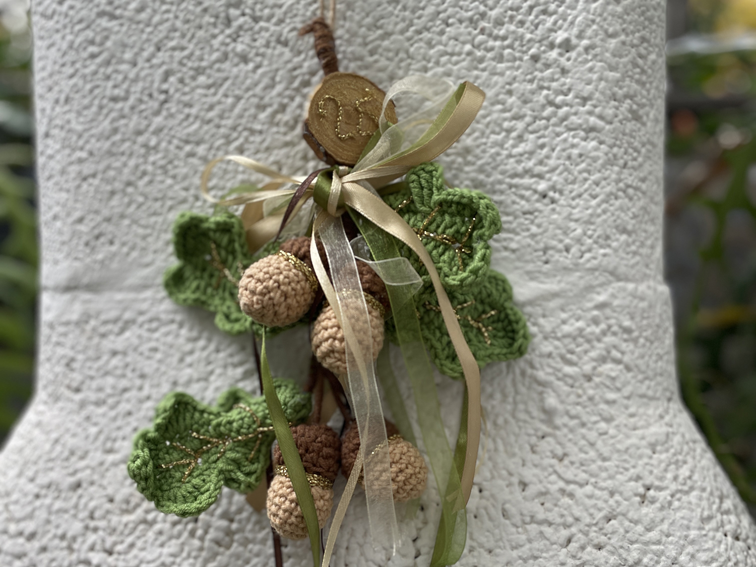 Ένα ξεχωριστό, πρωτότυπο χειροποίητο πλεκτό γούρι εμπνευσμένο από τη δύναμη και τη σοφία της φύσης. Τα τέσσερα πλεκτά βελανίδια, σύμβολα δύναμης, σταθερότητας, μακροζωίας και αφθονίας, είναι τοποθετημένα πάνω στο κλαδί τους, δημιουργώντας ένα μοναδικό διακοσμητικό φυλαχτό γεμάτο θετική ενέργεια και φυσική κομψότητα.