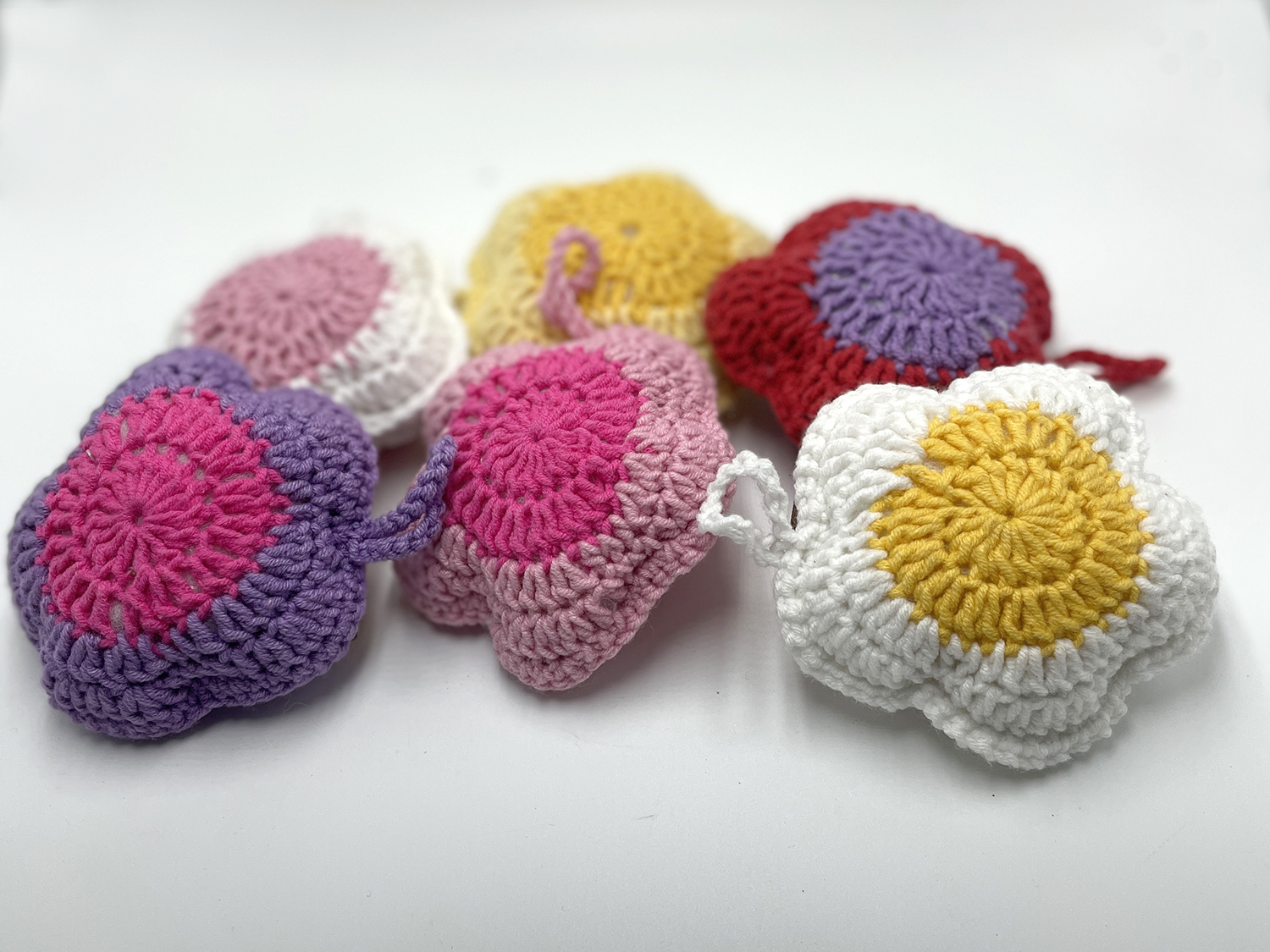 Πλεκτά λουλούδια σε διάφορα χρώματα. Ιδανικά για μπομπονιέρες βάπτισης, κεράσματα γέννησης, αναμνηστικά γενεθλίων και δώρα για διακόσμηση.