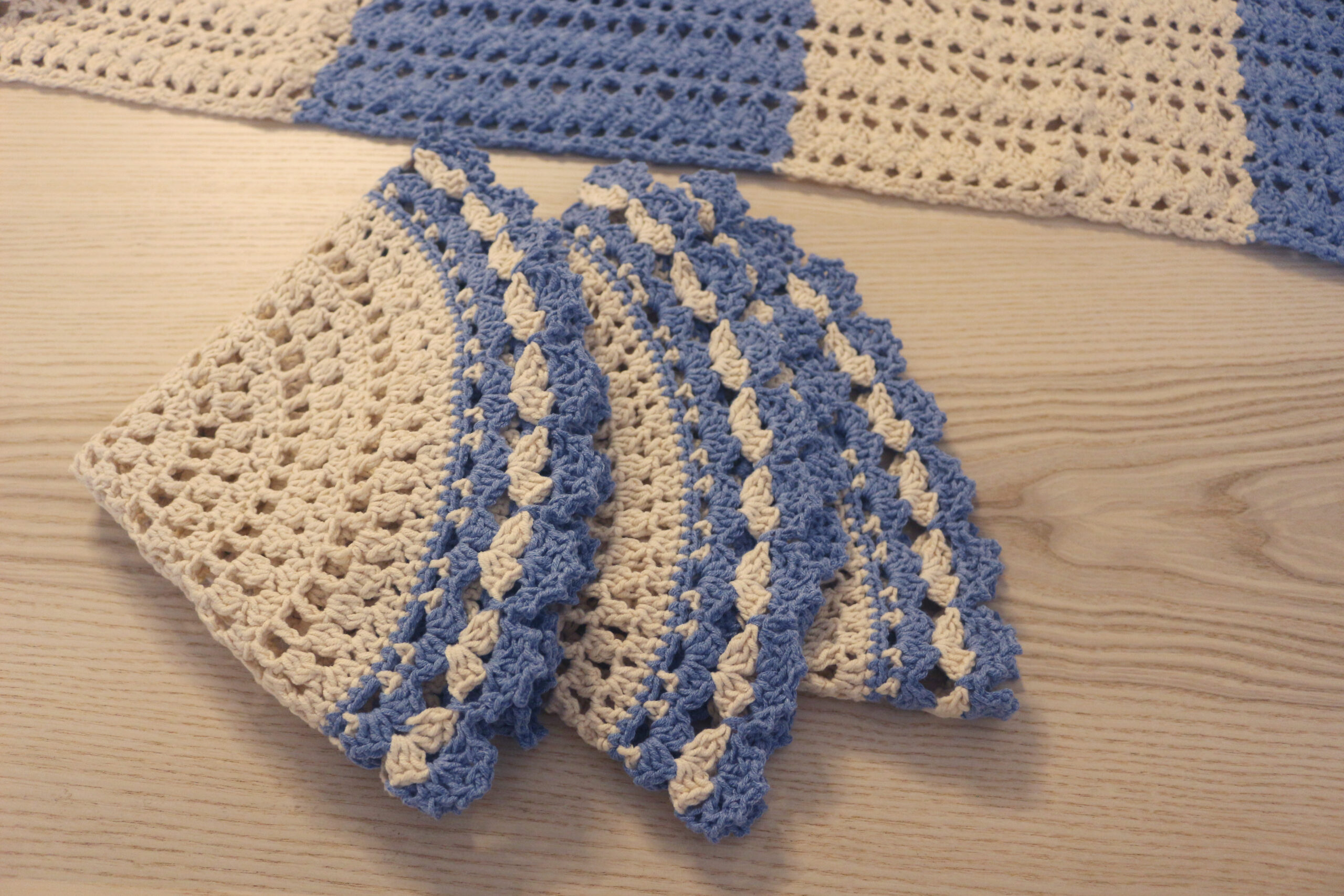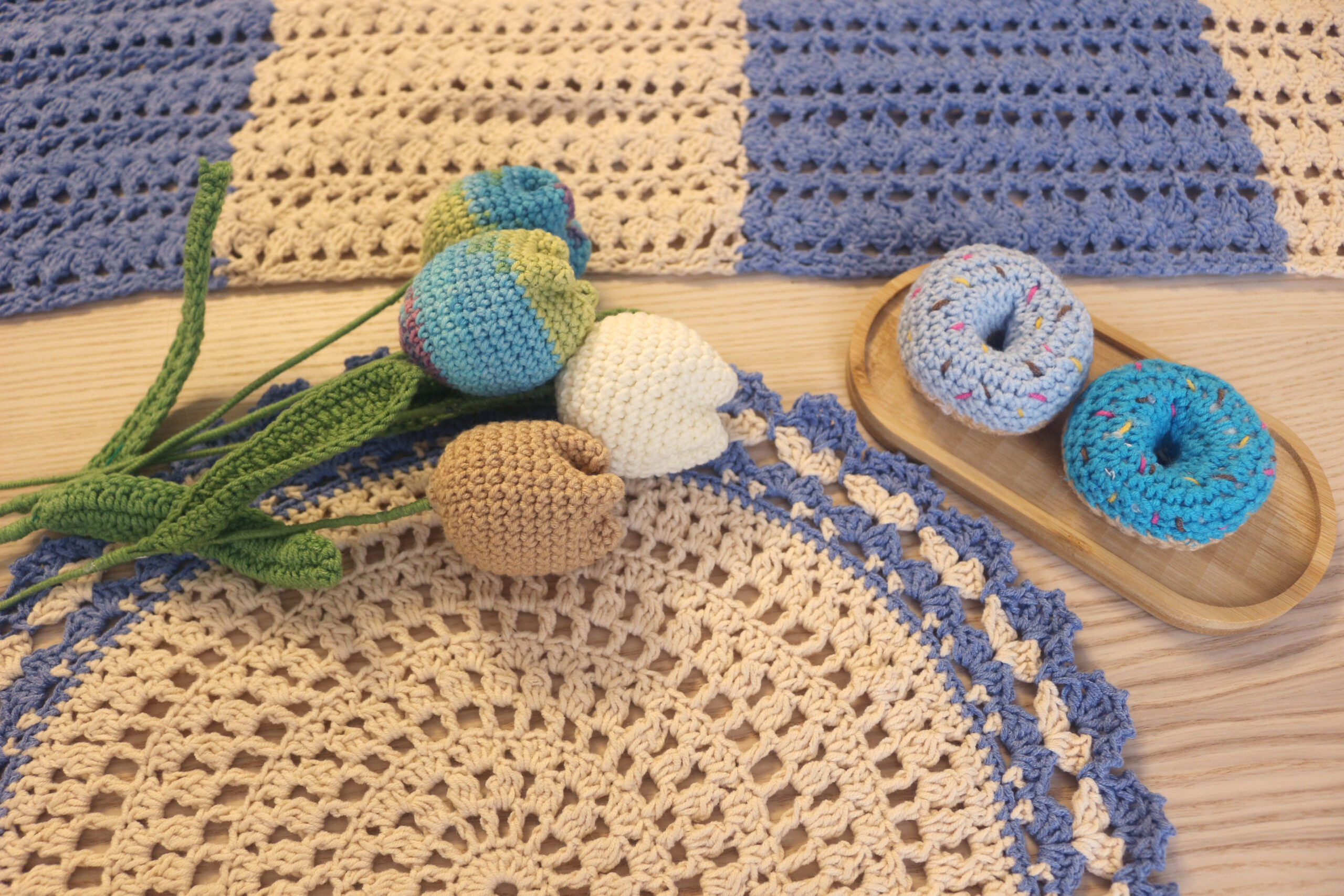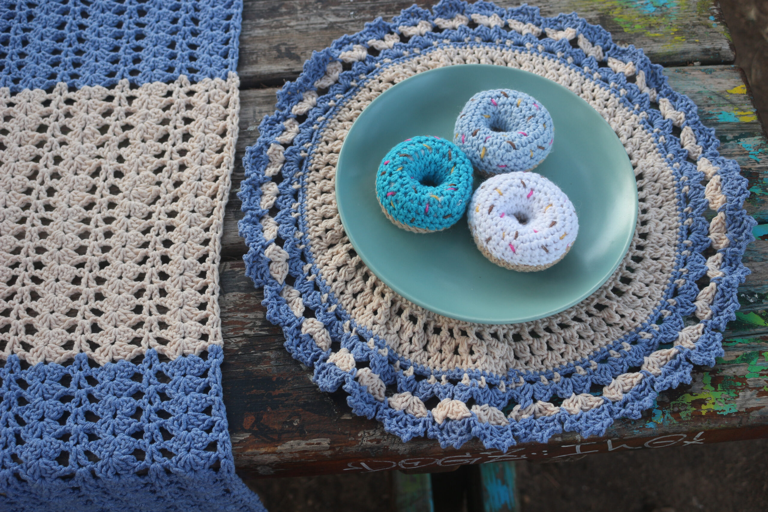 Χειροποίητα πλεκτά σουβέρ πιάτου σε αποχρώσεις του μπεζ και του μπλε. Εμπνευσμένα από την άμμο και τη θάλασσα, φέρνουν στο τραπέζι την ηρεμία του νησιού και την ανεμελιά της καλοκαιρινής αύρας.