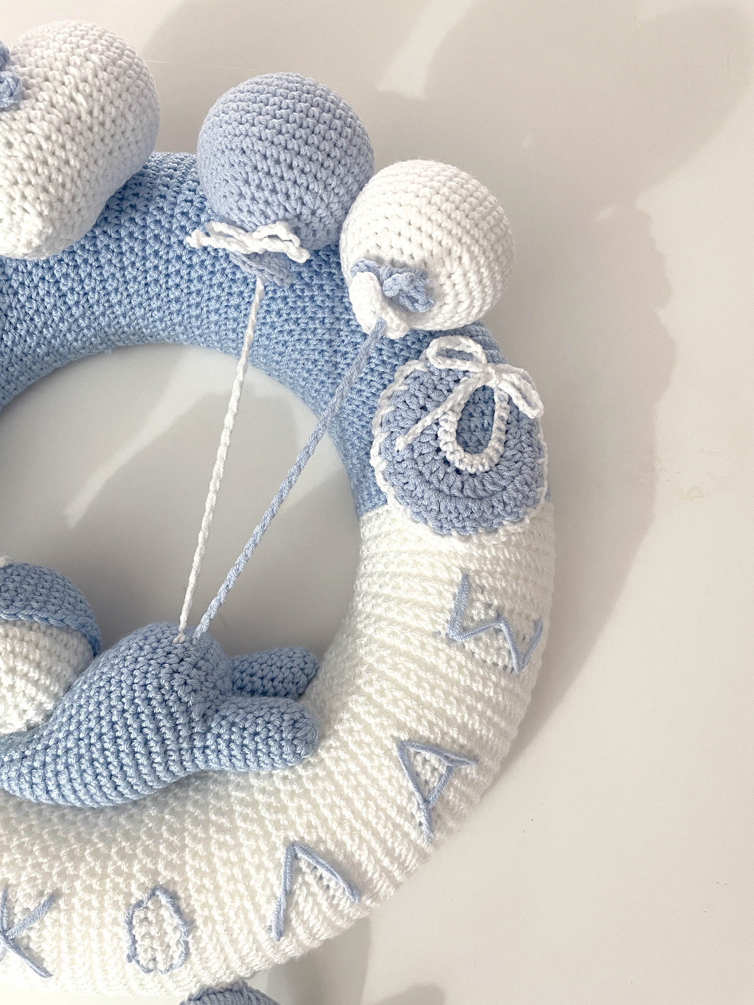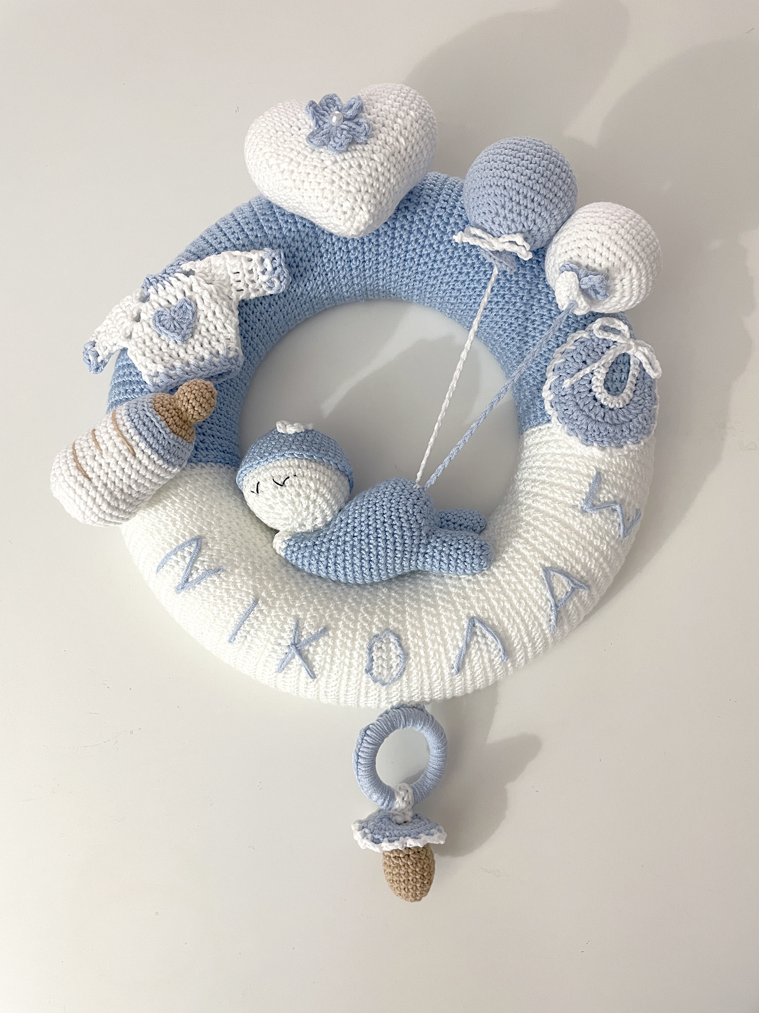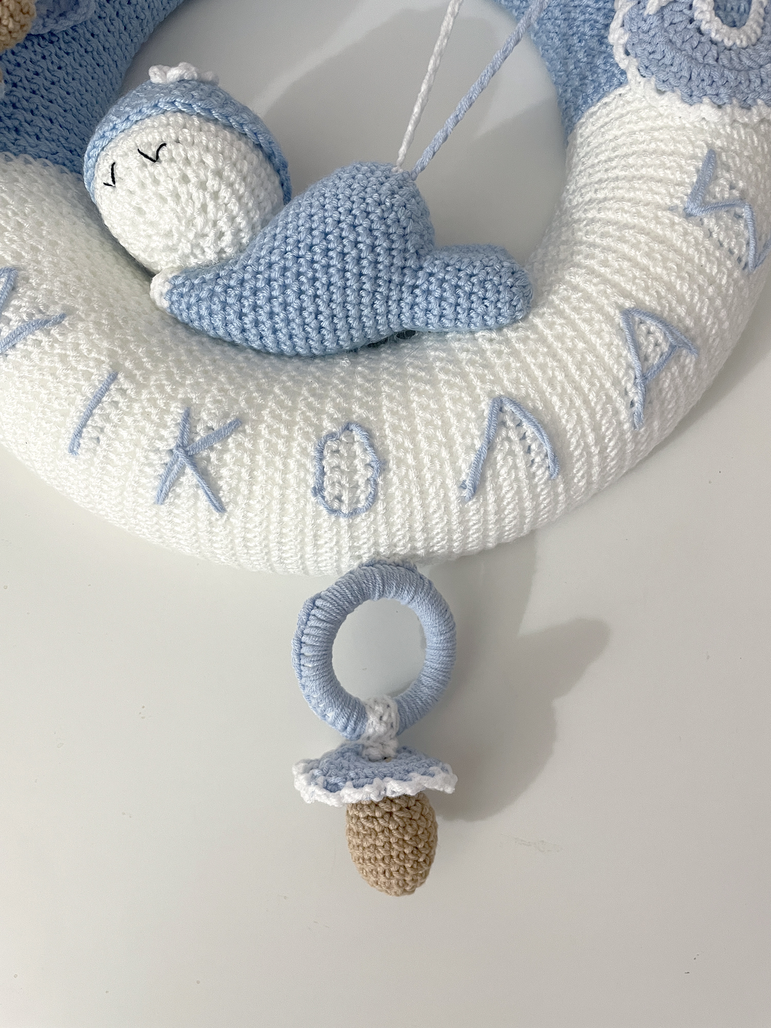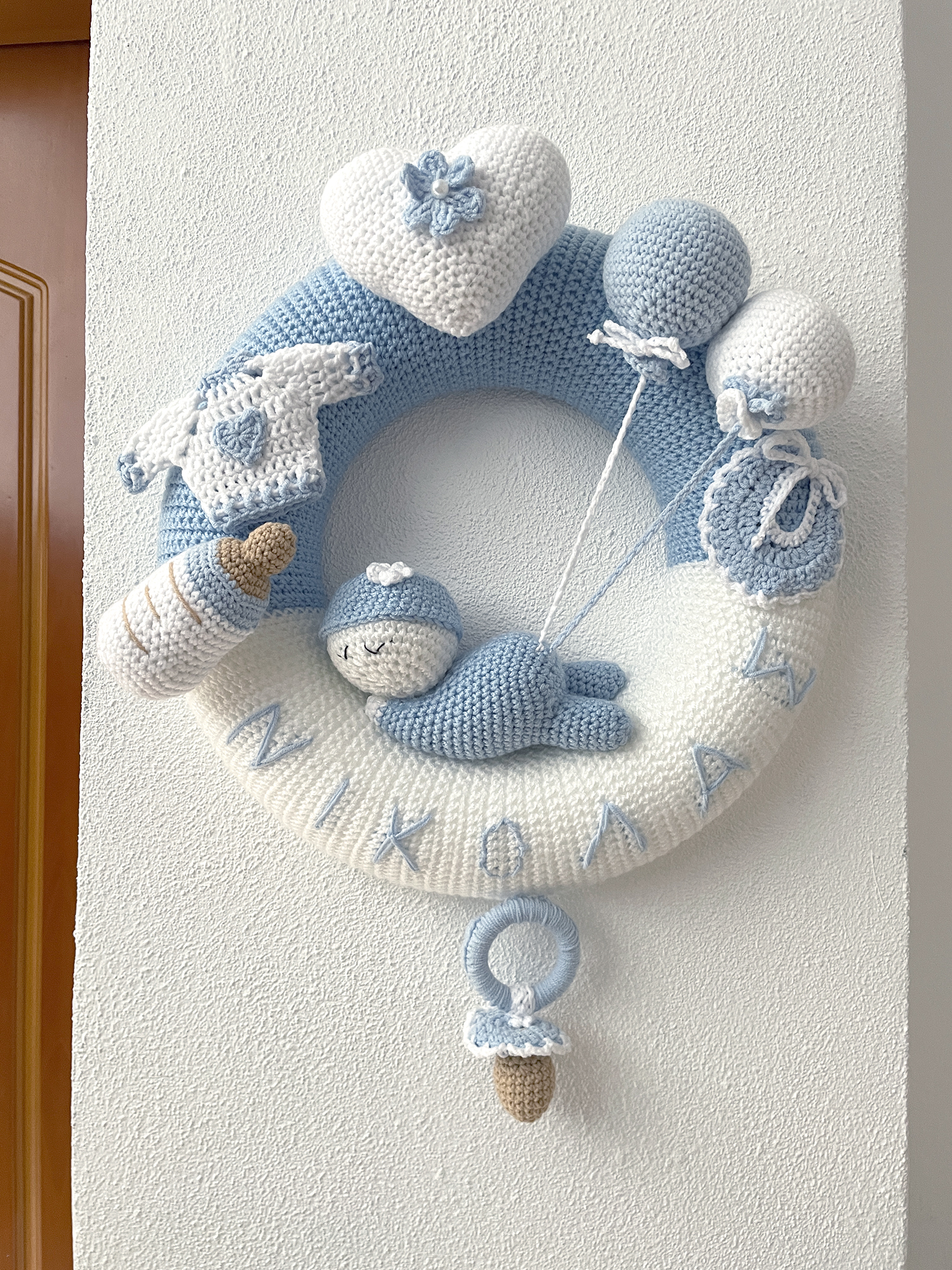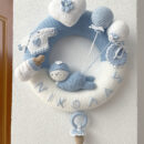 Τρυφερό και ξεχωριστό πλεκτό στεφάνι, σχεδιασμένο ειδικά για να καλωσορίσει ένα νεογέννητο αγοράκι στον κόσμο.